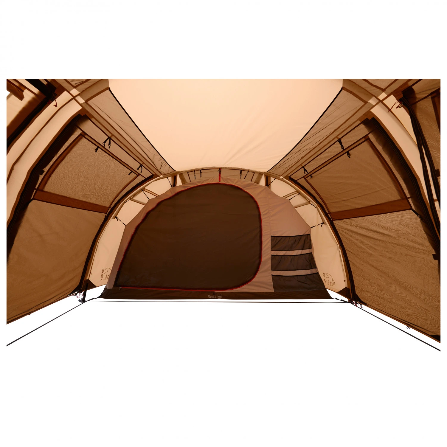 Die beiden Kabinen im Innern des Zelts lassen sich voneinander trennen. Um sich umzuziehen und sich komfortabel bewegen zu können ist das Zelt im Innern so hoch, dass die Camper aufrecht stehen können. Neben seiner gelungenen Optik ist das Zelt von außen dank der schlichten Farbgebung sehr unauffällig. So ist es mit dem Reisa 6 PU möglich auch Camping-Stellen aufzusuchen die nicht von Jedermann sofort gesehen werden sollen. Einsamkeit in der freien Natur mit der ganzen Familie ist somit garantiert. Um auch bei schlechtem Wetter sicher und stabil zu stehen, ist das Zelt mit robusten Schnüren und Heringen ausgestattet.