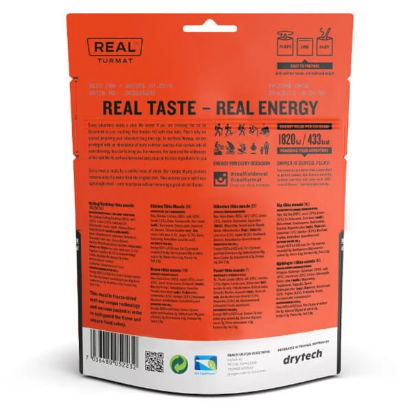 Von Indien inspiriert, am Nordpol produziert – das Chicken Tikka Masala von Real Turmat! Milder Reis bildet die Grundlage von diesem leckeren Eintopf. Hinzu kommen Fleisch von norwegischen Hühnern und frisches Gemüse. Kokosmilch, Ingwer und Koriander runden das Gesamtpaket schließlich perfekt ab, indem sie für diesen typischen Curry-Geschmack sorgen. Dank einer schonenden Verarbeitung behalten die Zutaten ihre natürlichen Aromen und eine gute Konsistenz, außerdem bleiben die Nähstoffe erhalten. Und um eine optimale Energie-Ausbeute zu garantieren, hält sich Real Turmat bei der Zubereitung an die Empfehlungen des Norwegian Nutrition Councils.